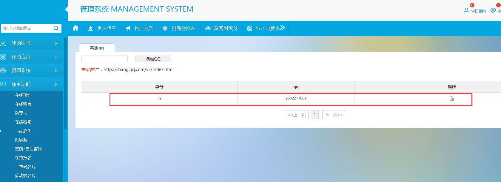 上面添加设置好后,同样要到微官网栏目设置添加链接,或添加到自定义菜单才能让粉丝跟QQ聊天互动。