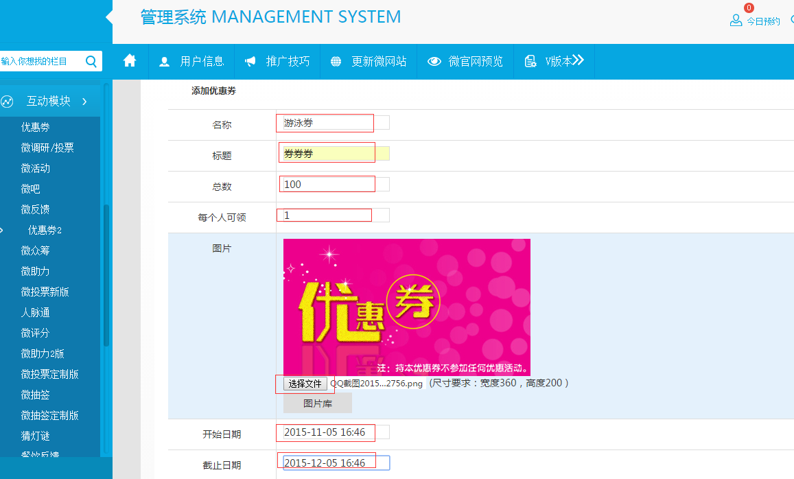 如上图,首先输入优惠券“名称”然后输入优惠券“标题”、“总数”、“每个人可领”数量,然后“选择文件”上传图片,选择“开始日期”、“截止日期”。