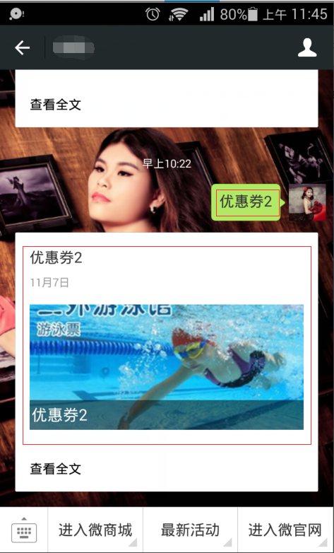 手机关注公众号,在关注页面回复“优惠券2”弹出如下对话框: