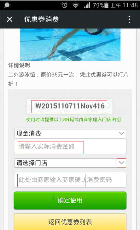 如上图,“优惠券SN码”显示出来了,这个“SN码”是消费的时候用的。“现金消费”,是指有了“优惠券”打折后的金额。下拉箭头“选择门店”,“消费密码”是由商家输入的,最后点击“确定使用”,“优惠券已经成功被使用”如下图所示: