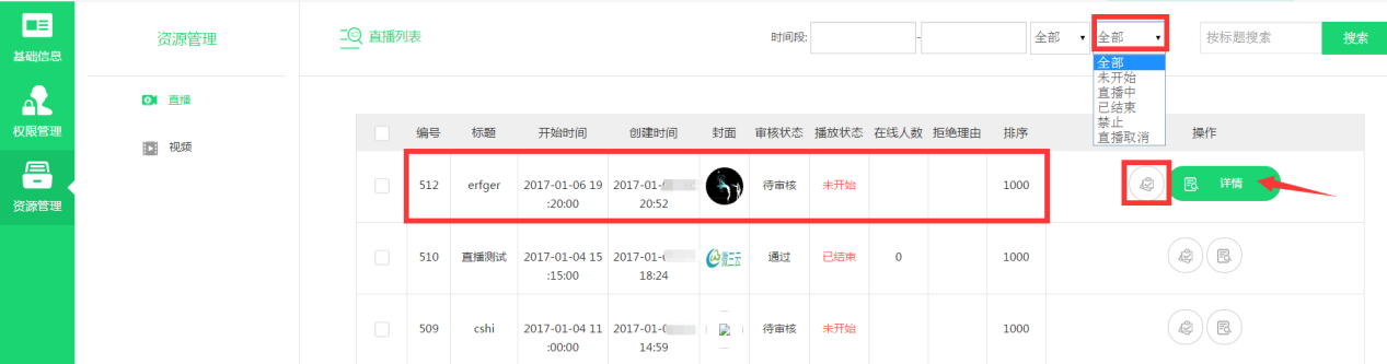 在直播列表页面可通过查找时间段/审核状态/播放状态/标题搜索的方式来查看直播列表,可查看内容有直播标题、开始时间、创建时间、封面、审核状态(网红在后台所添加的直播间,提交申请后由对应的机构进行审核)、播放状态、在线人数和拒绝理由。注:这里的排序默认是1000 也可以查看前端地址和详情,点击“详情”如下图18: