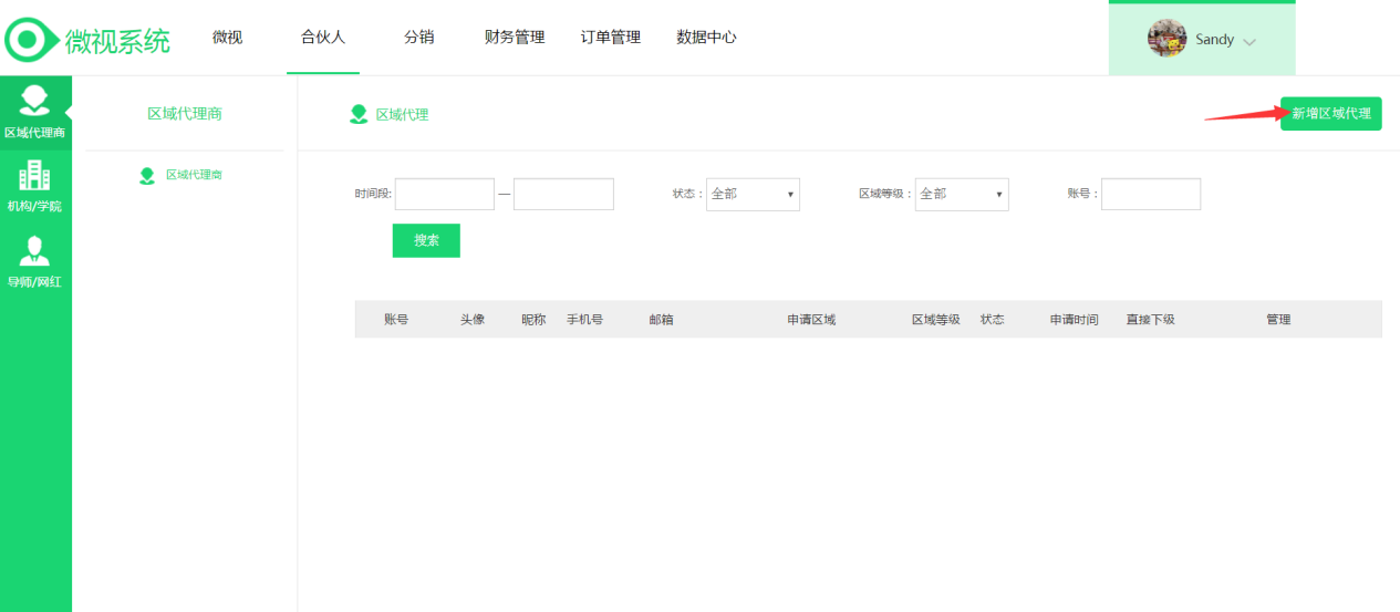 1、用户线下与代理商/平台进行联系沟通,由代理商/平台手动新增区域代理商(注;“审核”的工作则是由所负责管理这个区域的上级来负责审核)