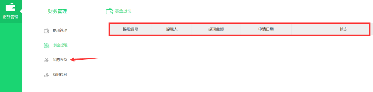 代理商可以通过查看赏金提现了解下面的网红申请提现的金额和日期(注:网红在手机端上申请赏金提现,就会自动提现到我的资产内,不需要通过后台审核默是“已发放”的状态)点击“我的收益”如下图37: