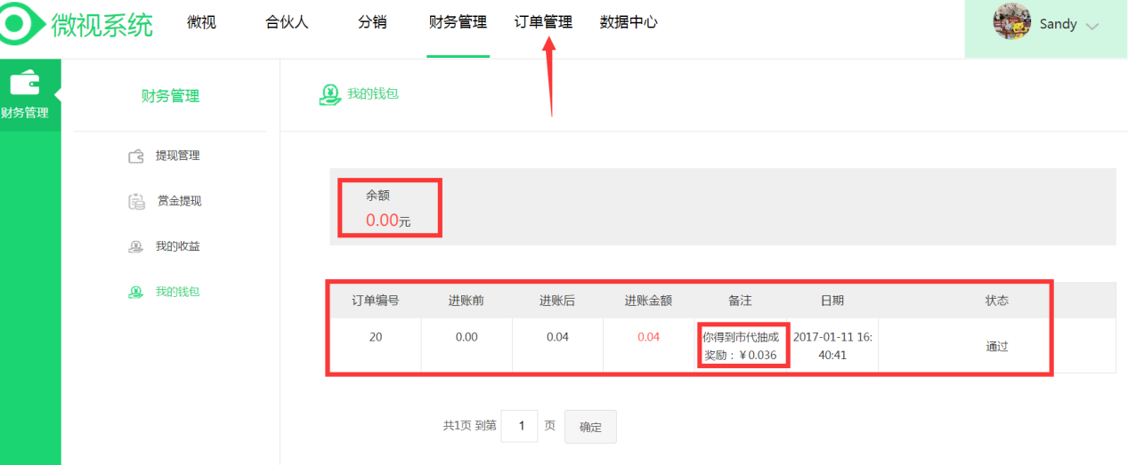 代理商可以通过查看“我的钱包”了解到每笔订单的进账明细和钱包余额,点击“订单管理”(注:计算结果显示两位小数,多余小数系统仍会计算)如下图39:
