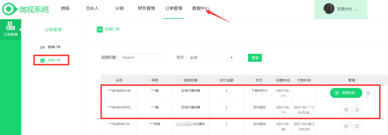 如上图在“视频订单”页面可查看到会员购买视频的订单记录,可点击返佣记录查看此订单的分佣信息,操作视频订单删除,点击“数据中心”如下图41: