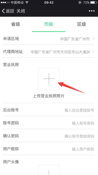 如上图21,点击要添加的区域等级(注:省代可以选择市和区的等级,市代则只能选择区等级),选择申请区域、填写代理商地址、填写身份证号码、真实姓名、用户昵称、手机号、邮箱和后台账号密码,然后上传头像、营业执照、身份正反面图片,最后点击“提交”菜单如下图22: